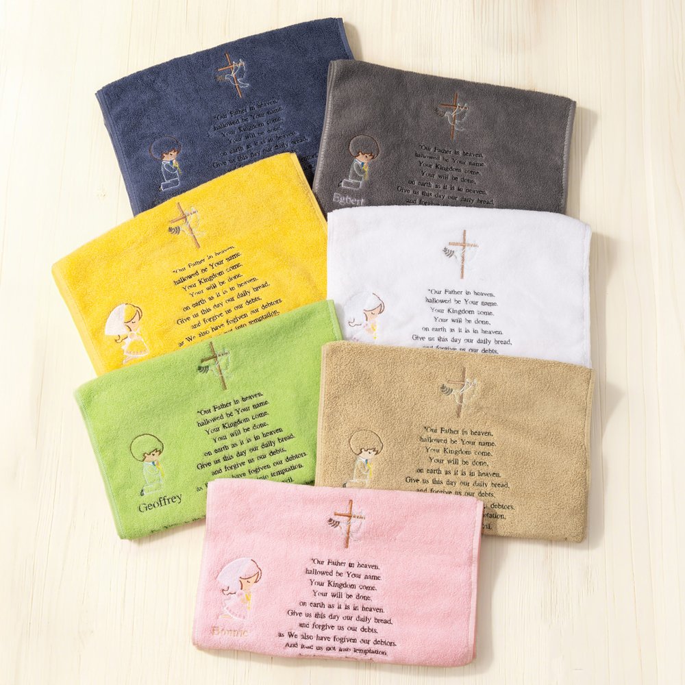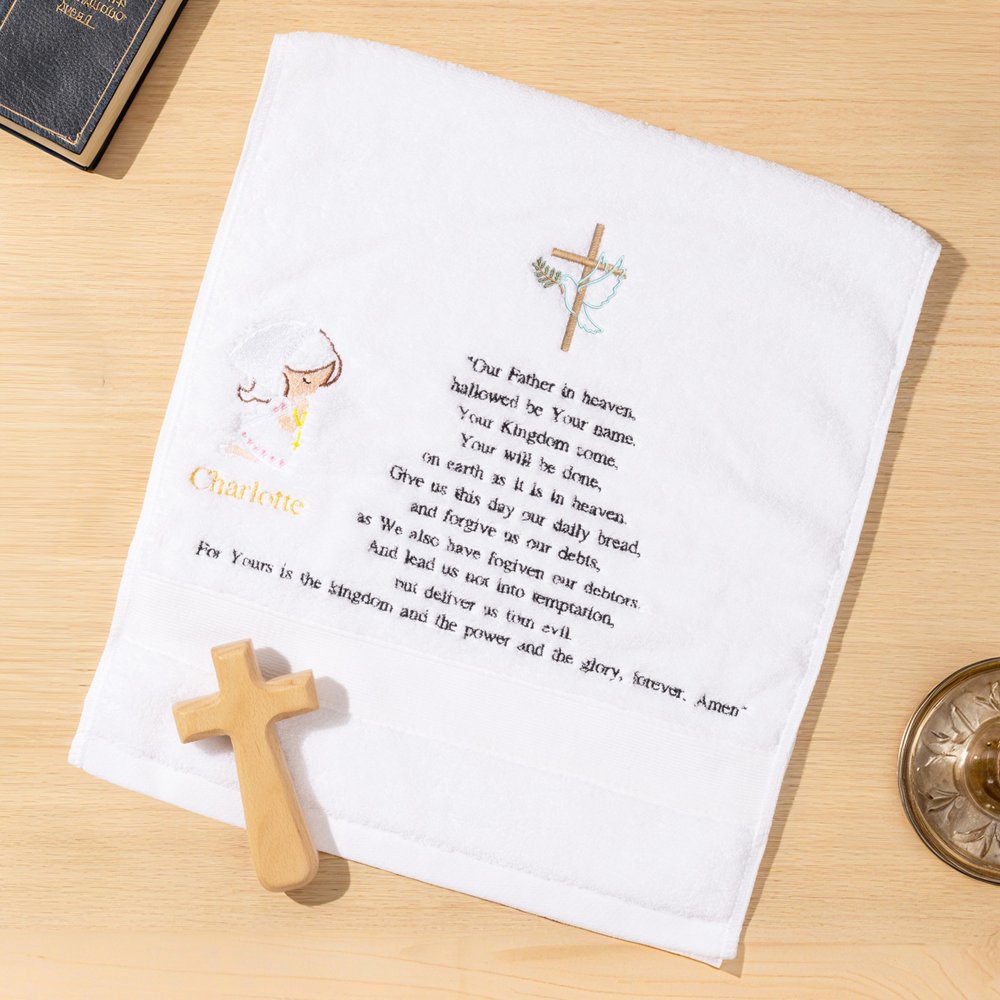 This elegant prayer towel features exquisite embroidery with classic patterns and the Lord's Prayer, available in dedicated designs for men and women. It can be personalized with the recipient's name, creating a deeply meaningful keepsake. Offered in multiple color options to suit different occasions and preferences.