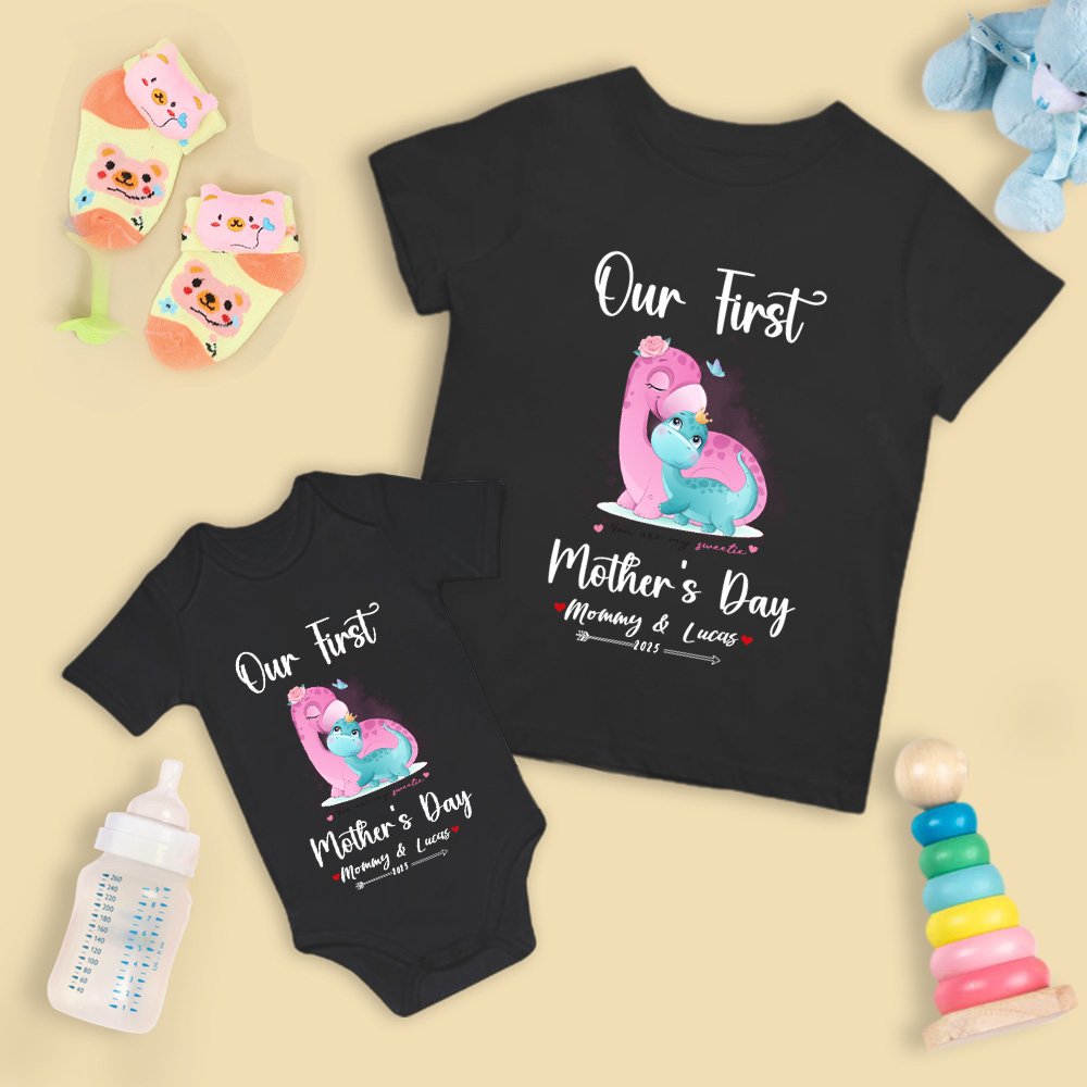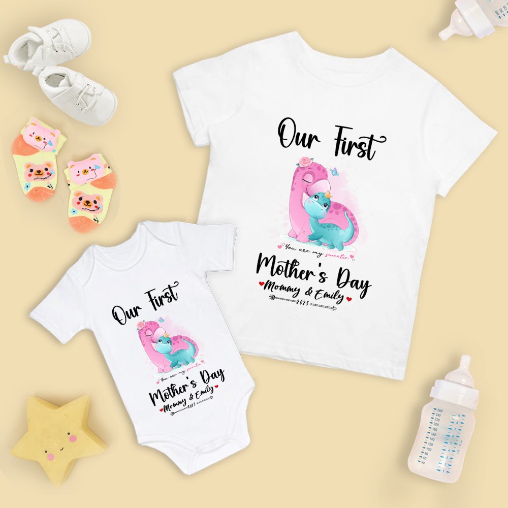 Our garments are designed with a cute parent-child dinosaur as the design element, the baby dinosaur is snuggled in the mother's arms, and the picture is beautifully warm and cozy, as a way to express the love between mother and child, and with the celebratory text of "Our First Mother's Day", which makes the festive atmosphere more strong and warm. We offer the option of adding your and your child's name to the front of the garment, this customization adds a personalized touch and makes the garment more meaningful.
