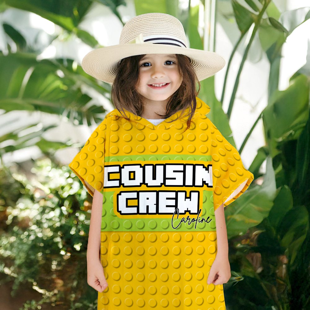Featuring 19 beach towel colors, a funny pixelated toy building blocks, and "cousin crew" title design, this oversized hooded beach towel can be personalized with a kid's name, adding a fun, playful touch to your kid's beach day or poolside experience.