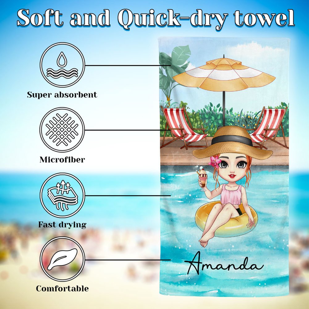 Personalize girl cartoon characters with diverse details - hair color, hairstyle, clothing, sunglasses, and summer elements like swimming rings for playful charm. Add your exclusive name print to highlight unique style, turning each beach towel into a thoughtful, one-of-a-kind gift.