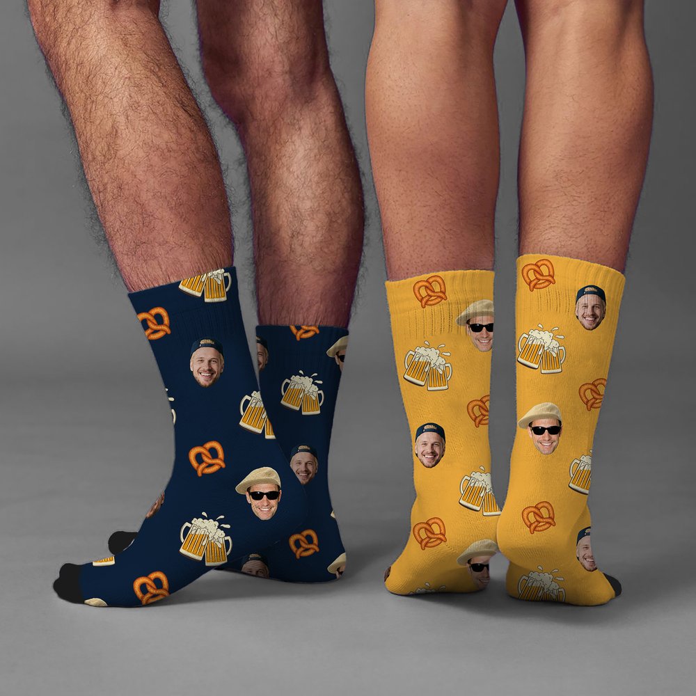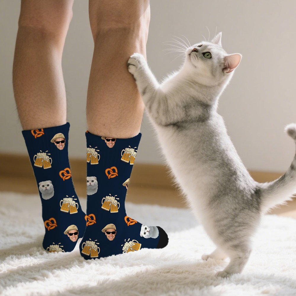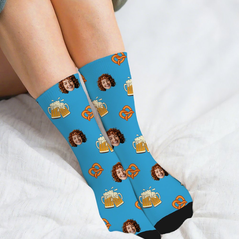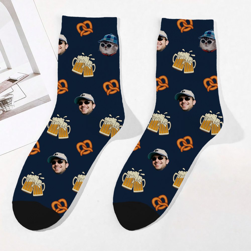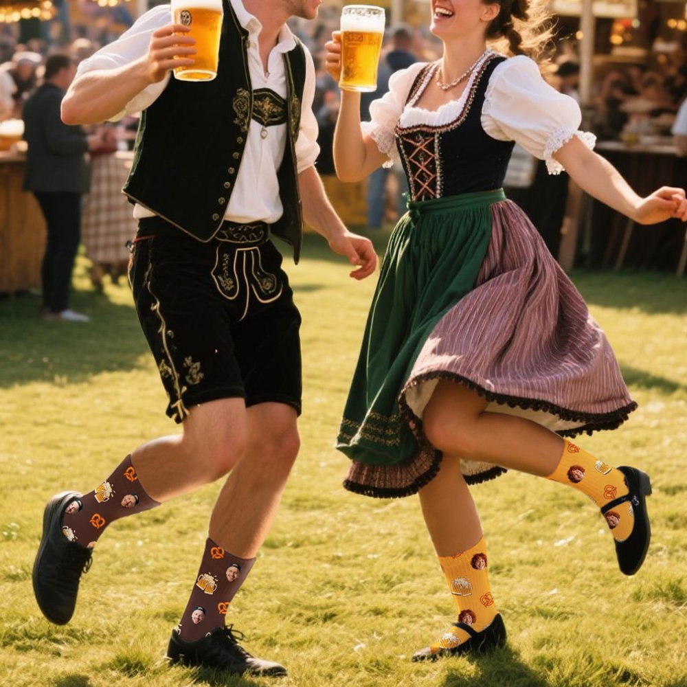 These socks are inspired by the iconic elements of European beer festivals, featuring playful pretzel and beer patterns that capture the lively spirit of celebration. Available in 6 vibrant colors with custom portrait prints, each pair becomes a personalized keepsake—every wear revives the clatter of beer steins and the buttery scent of pretzels.