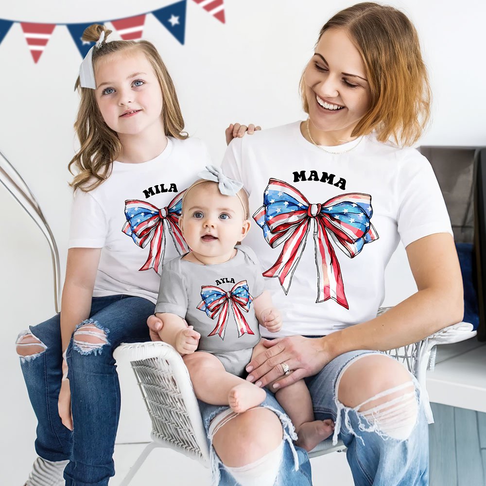 This matching outfit set ingeniously combines the classic red and blue colors of the American flag with a chic bow element, cleverly reinterpreting the combination of patriotic feelings and fashion trends, symbolizing the profound heritage of freedom and courage. It is not only a masterpiece that pays tribute to the American spirit, but also a fashion statement of individual style.
