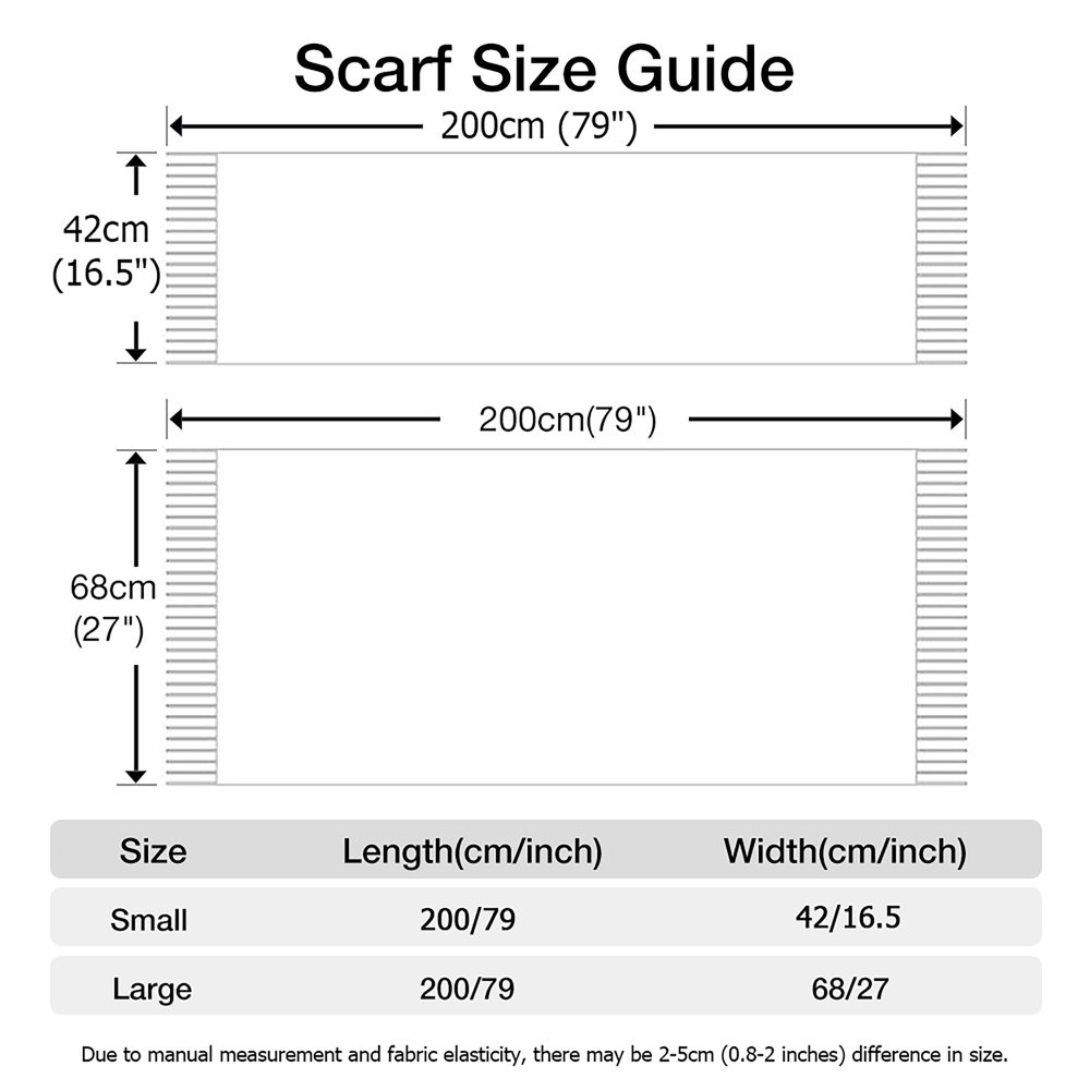 | Care: | β’ Hand-Wash Preferred - Fill a basin with cool to lukewarm water and add a small amount of mild detergent. Gently swirl the scarf in the soapy water. β’ Machine - Wash (if necessary) - Place the scarf in a mesh laundry bag to prevent it from getting tangled or damaged. Use a mild detergent. β’ Avoid Wringing - Do not wring out the scarf, as this can distort its shape. Instead, gently press out excess water with a towel. β’ Air-Drying - Lay the scarf flat on a clean, dry towel to air - dry. Avoid direct sunlight, as it can fade the color. You can also hang the scarf to dry, but make sure it is supported well (e.g., on a wide - hanger) to prevent stretching. β’ Low-Heat Ironing - If needed, iron the scarf on a low - heat setting. Use a pressing cloth between the iron and the scarf to prevent direct heat contact, which could damage the fabric. |