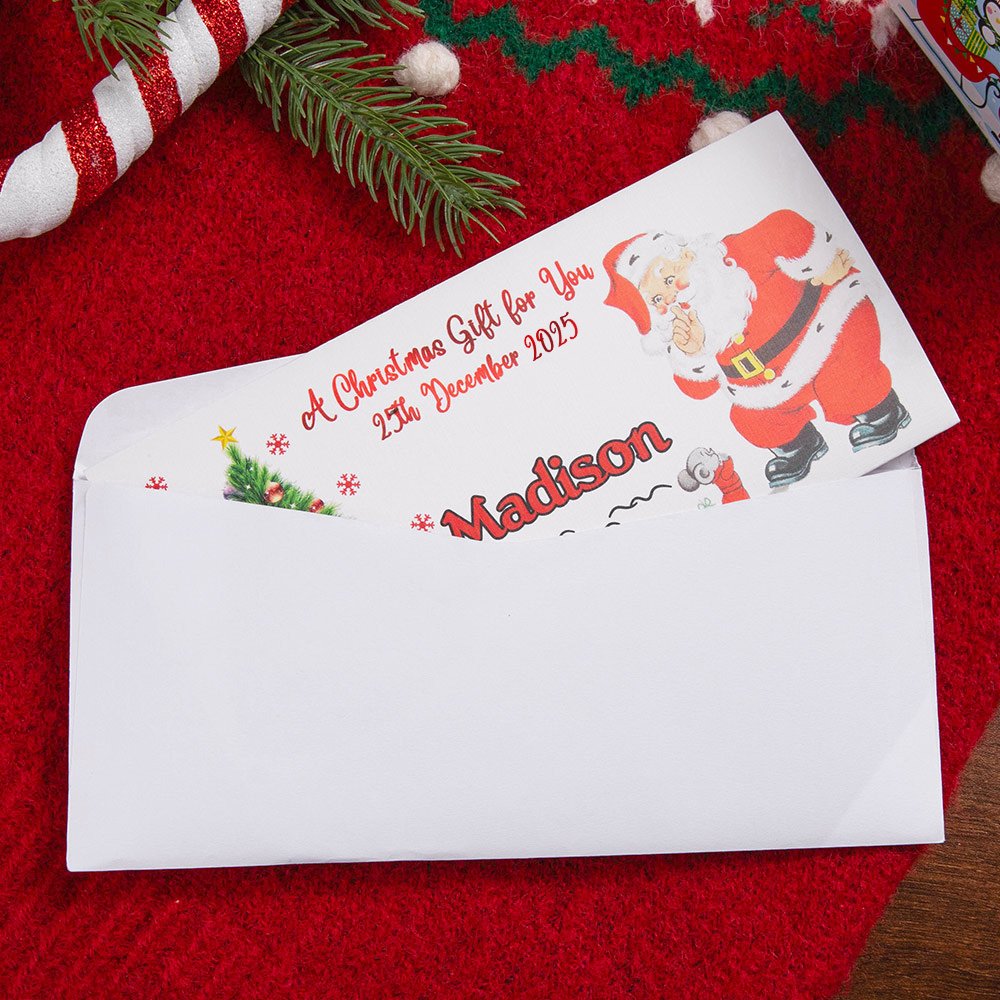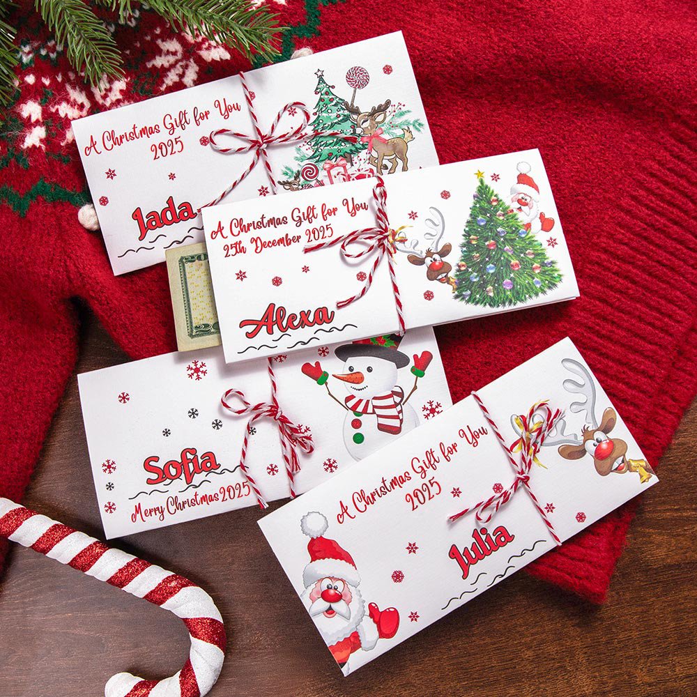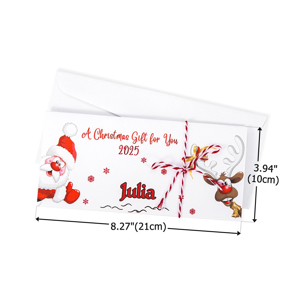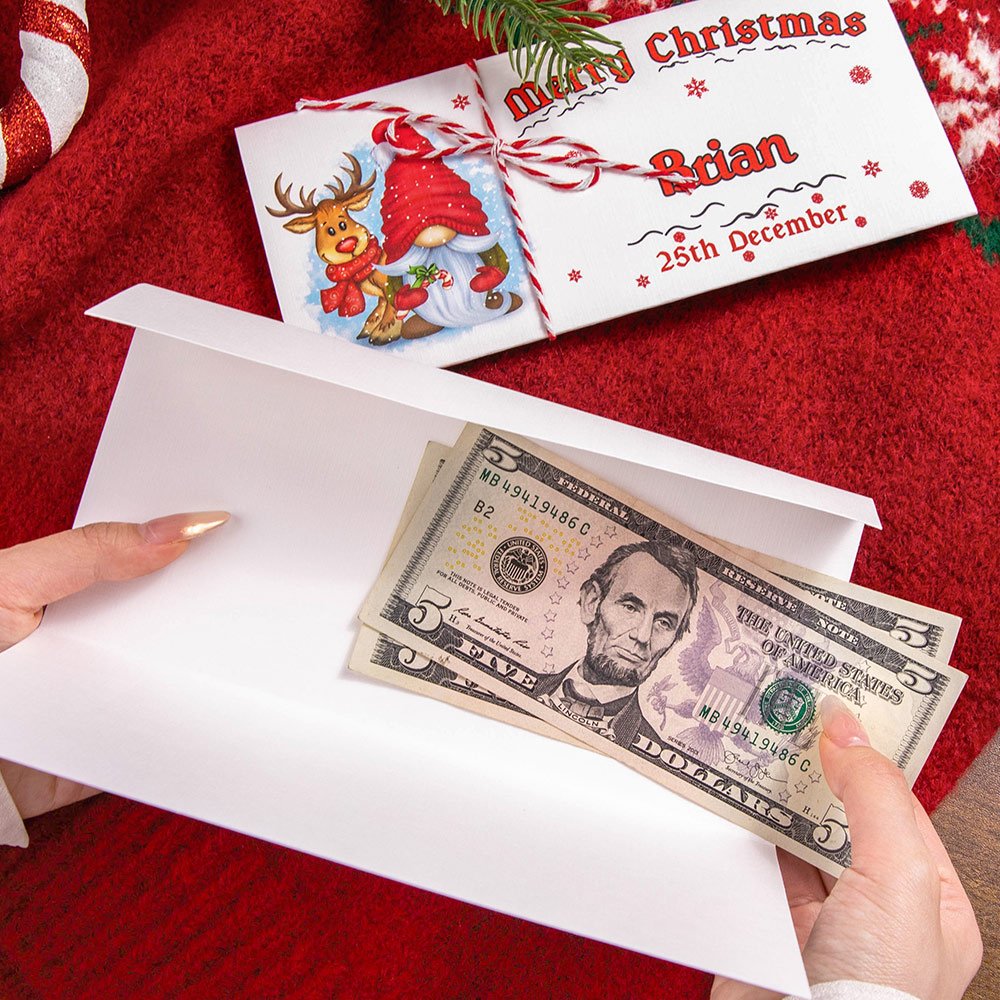 This Christmas money wallet showcases a charming design featuring Santa, an elk, a Christmas tree, and a snowman, making it a standout choice for your holiday greetings. You can easily customize it with a name, adding a heartfelt personal touch to your cash gifts.