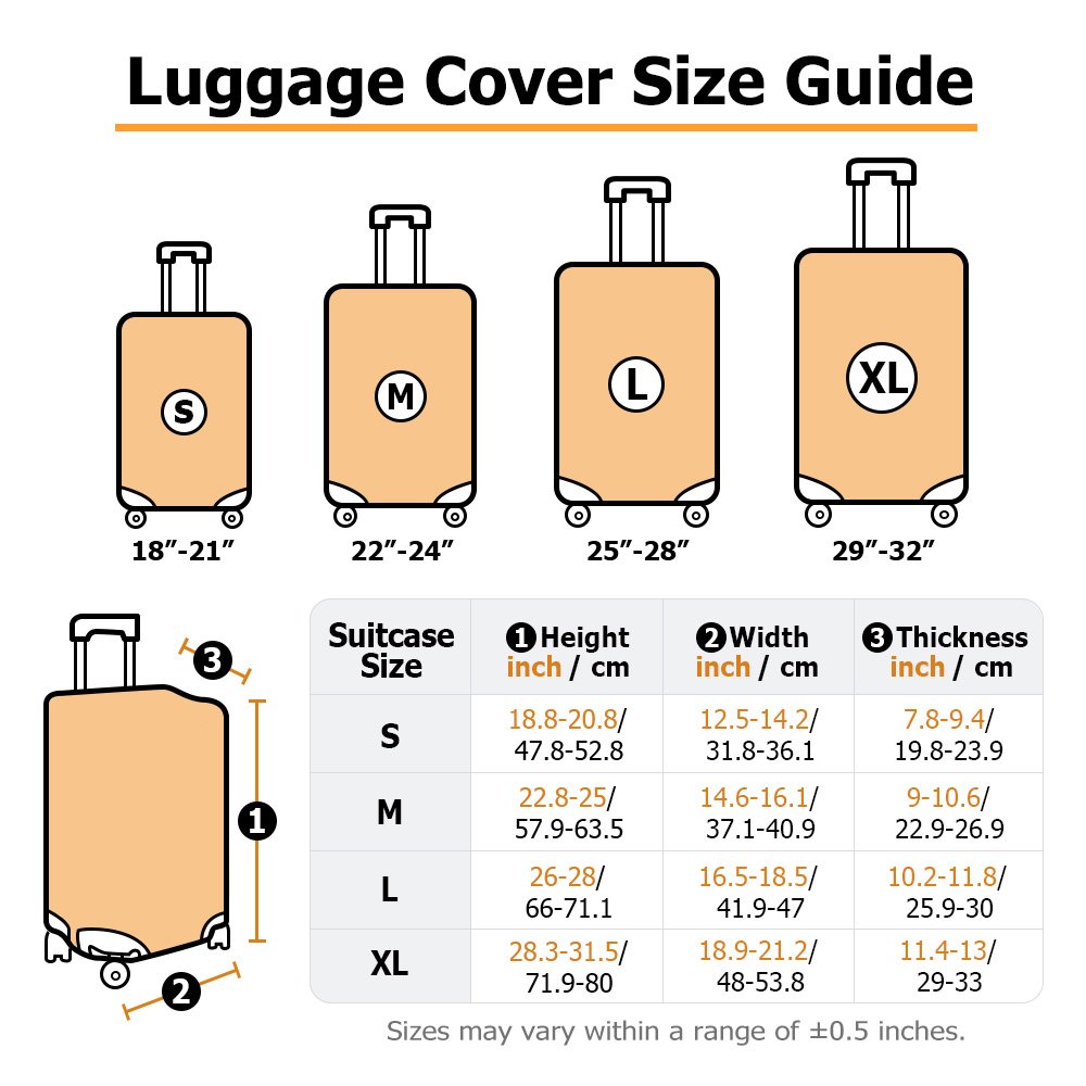 | Measurement: | S - Fits 18"-21" (45.7cm-53.3cm) Suitcase M - Fits 22"-24"(55.9cm-61cm) Suitcase L - Fits 25"-28"(63.5cm-71.1cm) Suitcase XL - Fits 29"-32"(73.7cm-81.3cm) Suitcase |