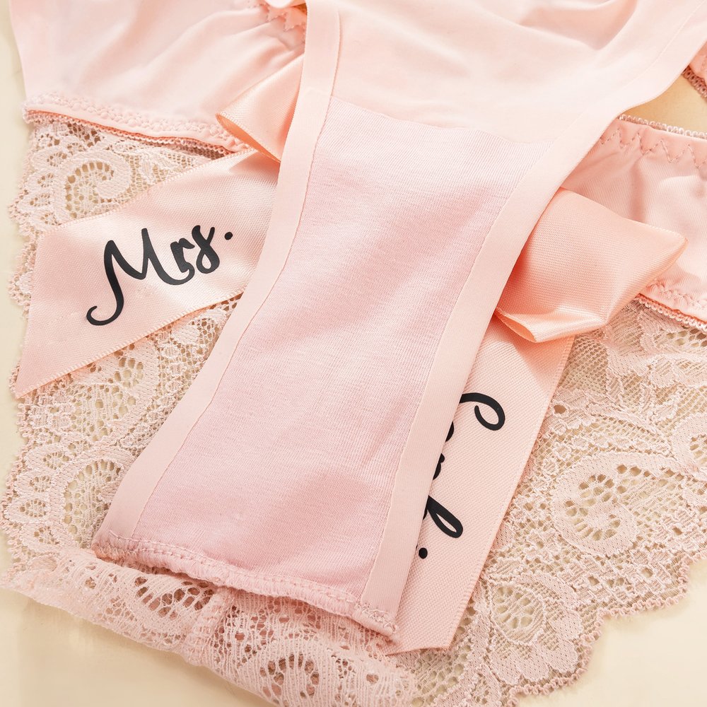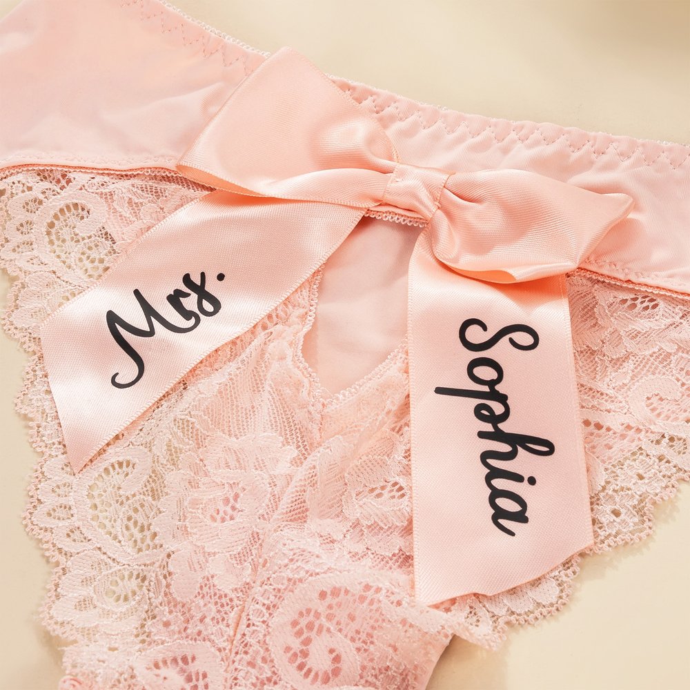 Our custom bow lace panties add a playful and romantic touch to your lingerie collection. You can customize your name and choose from three colors: black, white, and lotus pink to create a unique piece.