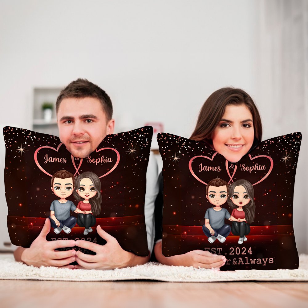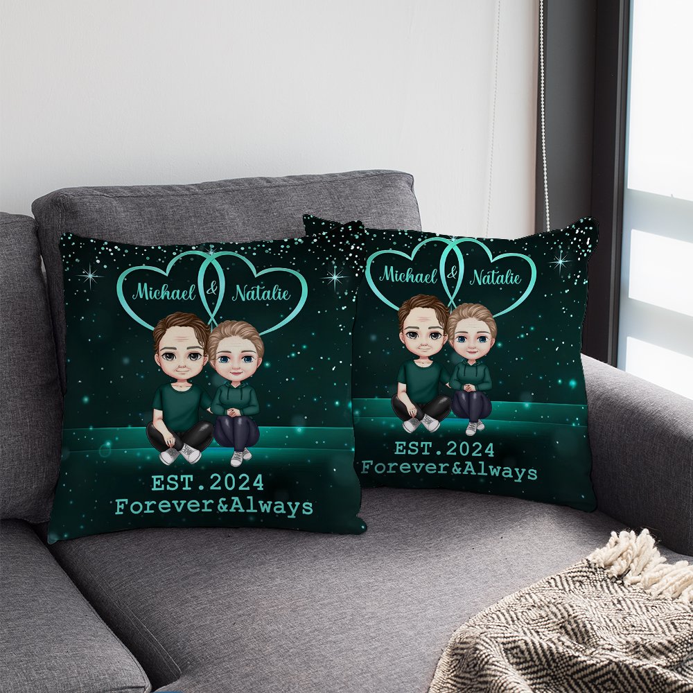 This personalized pillow features a cute cartoon couple sitting under a romantic starry sky. It is decorated with a double heart pattern, which can be customized with the couple's name. Under the characters, special years and text can be added, symbolizing love and romance.