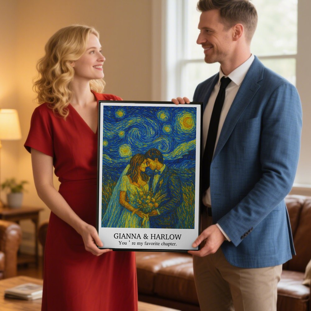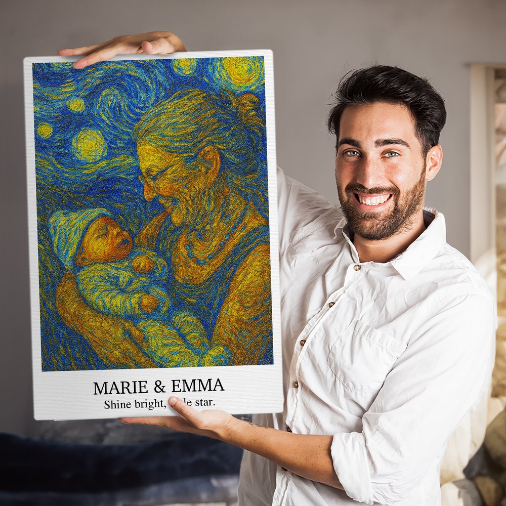 Upload a cherished photo – be it of family, pets, or friends – and we’ll artistically transform it into an oil-painting masterpiece, beautifully preserving your memories. Add a custom name and text for a personal touch, creating a one-of-a-kind artwork that’s uniquely yours.