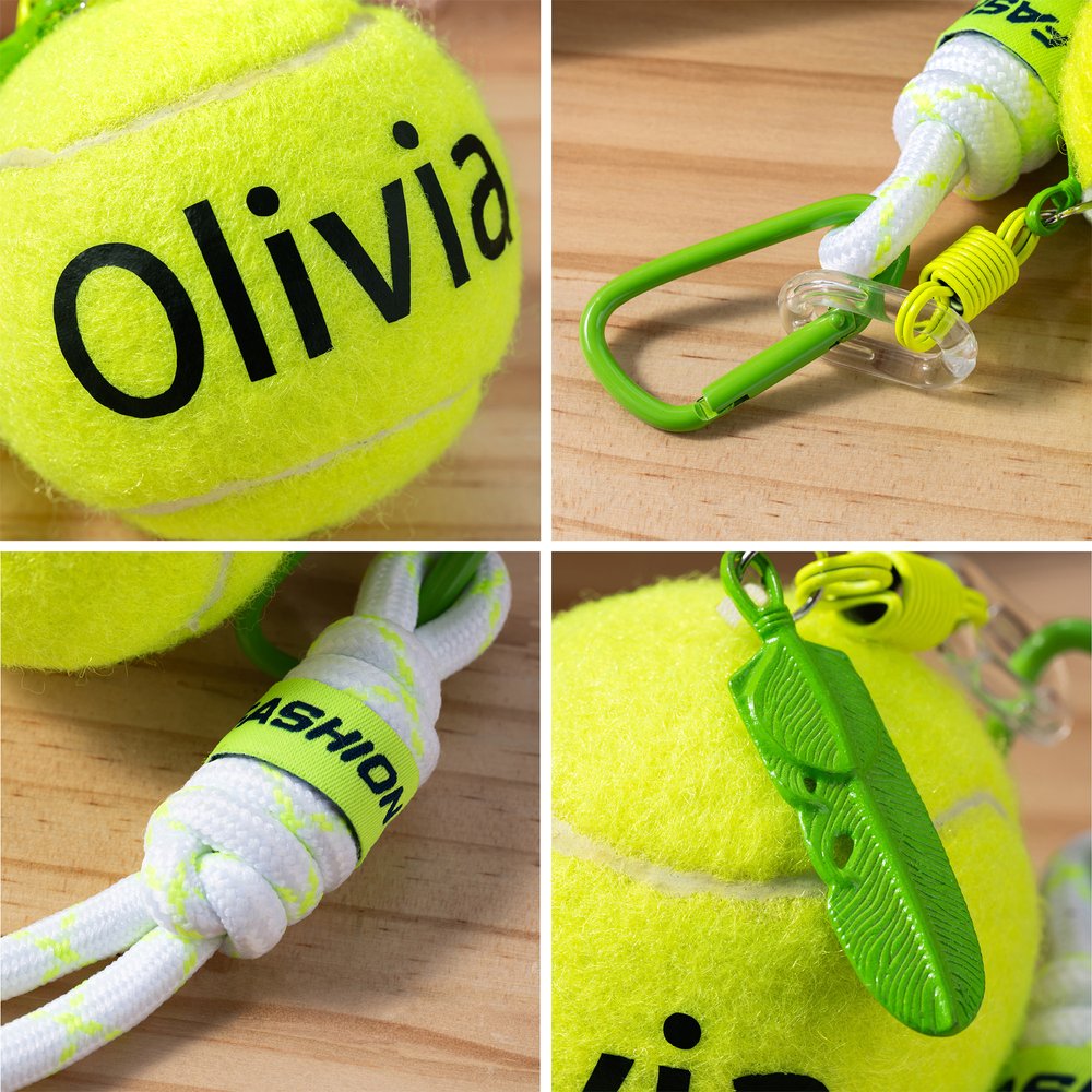 Our keychain features a vibrant tennis ball design in pink and fluorescent yellow, with a felt finish that recreates the unique feel of a real tennis ball. It comes with a variety of accessories, and you can select from a variety of name color options for your name, making it truly unique to you.