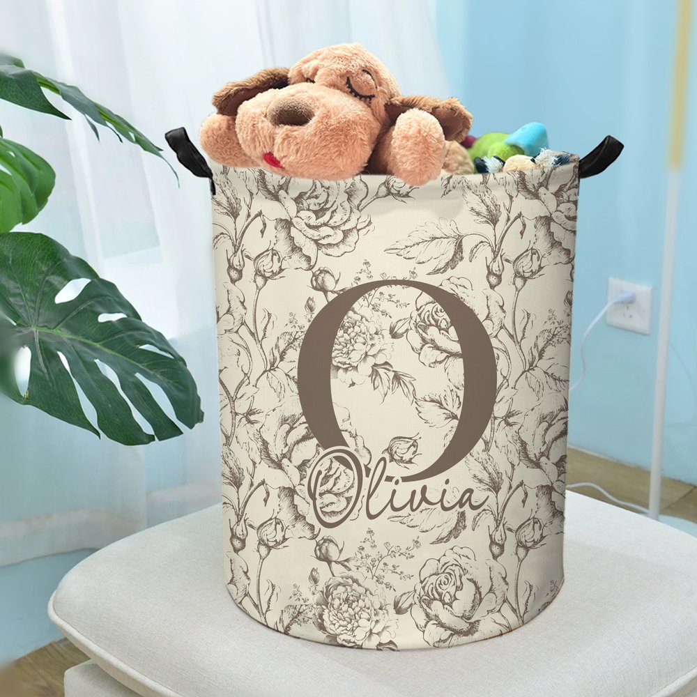 This laundry basket features a timeless floral design in the classic Toile de Jouy style, adorned with customizable monograms and names for an added touch of personalization. It perfectly blends elegance and practicality, making it a charming addition to any home.