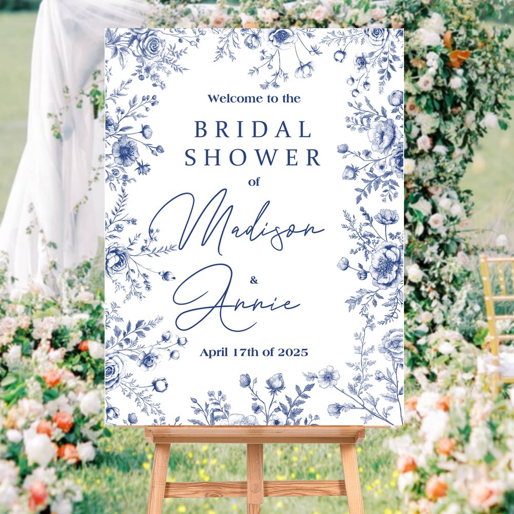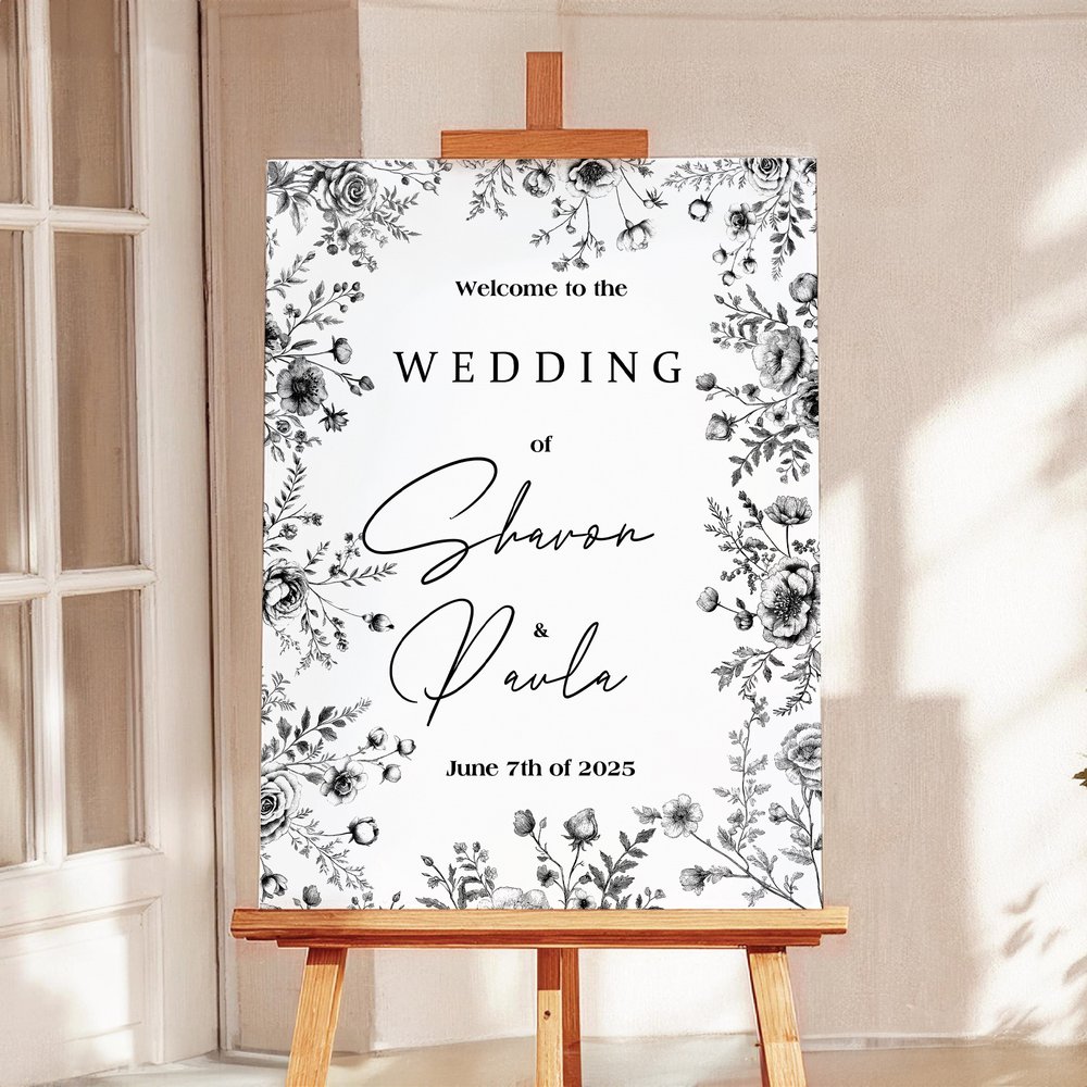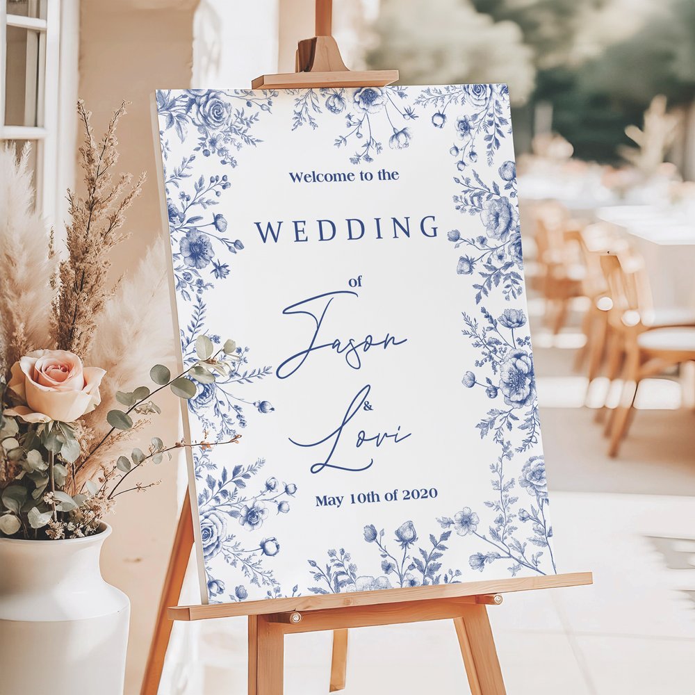 This stunning welcome sign features a beautiful Toile de Jouy-style design, personalized with the names of the bride and groom, as well as any additional text you desire. This distinctive detail infuses your wedding decor with timeless elegance, effortlessly becoming a standout focal point that lingers in guests' memories.