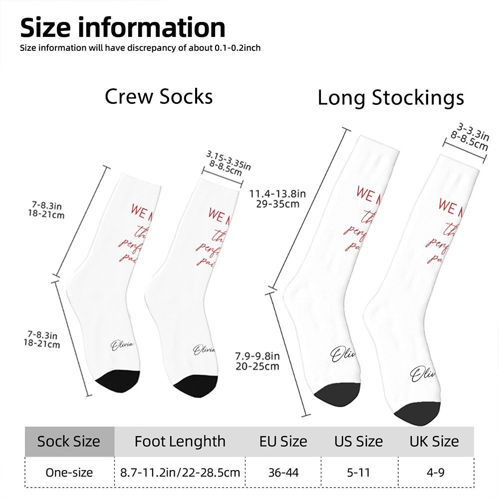 Our socks feature a romantic design, and each sock prints half a heart that becomes complete when worn together. You can customize them with a couple's or newlyweds' names, accompanied by the bold statement 'We Make the Perfect Pair', showcasing your perfect match to the world.