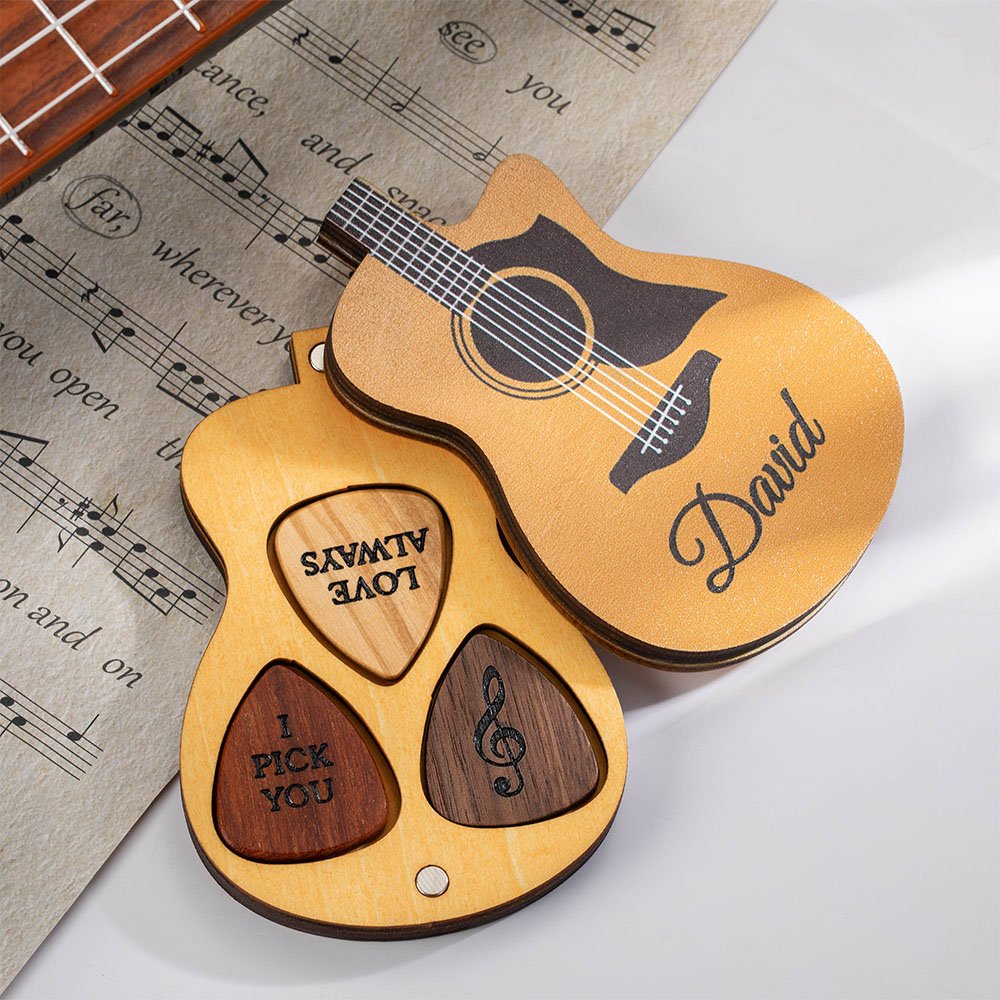 This wooden guitar pick designed by Callie is made of natural wood to make your guitar sound special. Classic and retro, elegant and unique, exquisite and refined, the guitar pick case can be customized with the text you want.