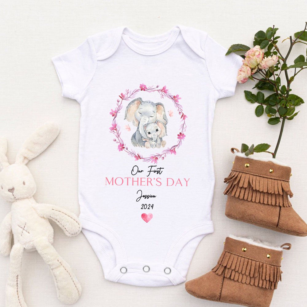 The Garland Elephant design on T-shirts and onesies is so cute and creates a warm and playful look. The celebratory text of "Our First Mother's Day" makes the holiday atmosphere more intense and warm. With the option to add your and your child's names to the front of the garment, this adorable set is the perfect gift for a new mom and her precious child's first Mother's Day.